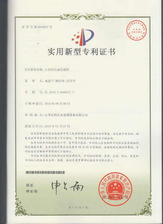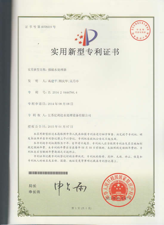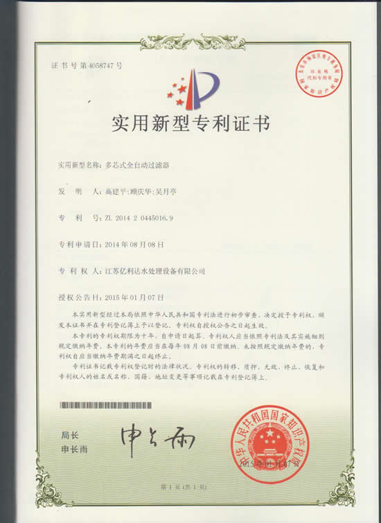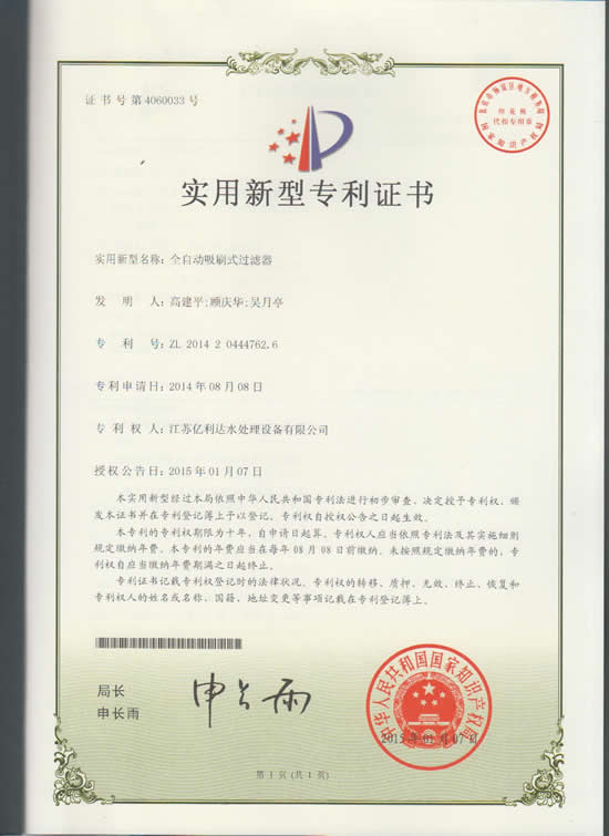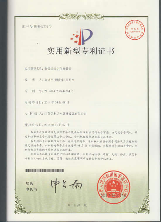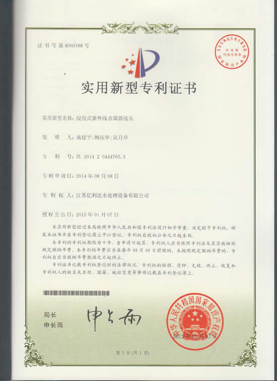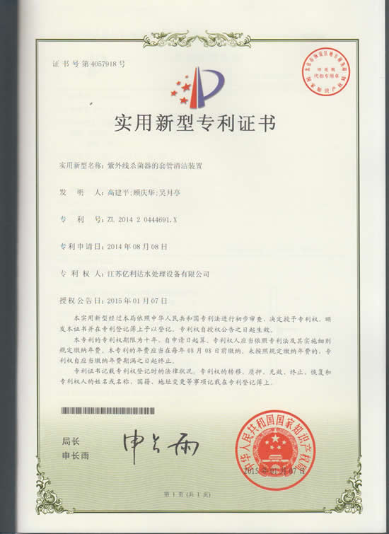 2015/2/3 15:23:58 2014年08月08日,江蘇億利達(dá)水處理設(shè)備有限公司申請(qǐng)以下專利: 紫外線殺菌器的套管清潔裝置