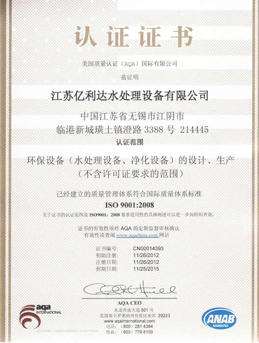2013/7/27 18:16:55 江蘇億利達(dá)生產(chǎn)的:環(huán)保設(shè)備(水處理設(shè)備、凈化設(shè)備)的設(shè)計(jì)、生產(chǎn)已經(jīng)建立的質(zhì)量管理體系符合國際質(zhì)量體系標(biāo)準(zhǔn)