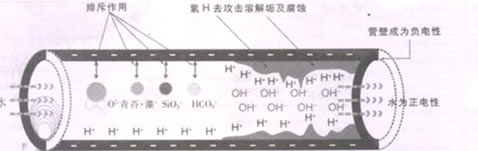金屬銹蝕需要氧,高頻電磁能量的作用使單個水分子包溶了溶解在水中的氧分子,使溶解氧成為惰性氧,封斷了金屬銹蝕所需的氧的來源。同時,高頻電磁波激起了懸垂復合調(diào)制頻率的電磁場所產(chǎn)生的“集膚效應”,在管壁上聚集了過剩的負電荷,而在水內(nèi)部聚集了過剩的正電荷。正電荷強烈排斥帶正電的同性Fe3+,阻止Fe失去電子變成Fe3+,從金屬管壁分離進入水中;同時管壁上過剩的負電子也不斷地吸引帶正電的Fe3+,阻礙Fe3+溶入水中;從而使原管壁上的Fe2O3(紅銹)還原成具有極強耐腐蝕力的黑銹外膜Fe3O4。