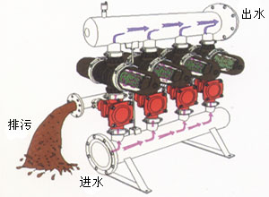 控制器控制閥門改變水流方向。盤片被松開,位于盤中央的噴嘴沿切線噴射,使盤片旋轉,盤上截留的固體物被沖洗出去。